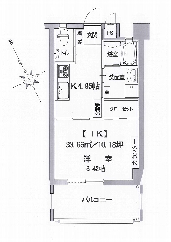 1K - 洋8.42 / 専有面積:33.66m²